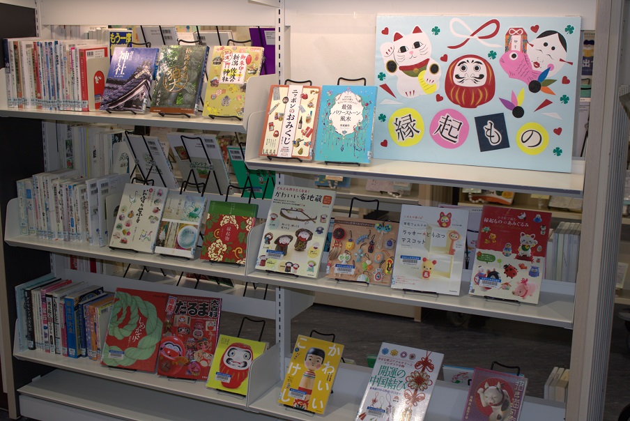 ■テーマ展示コーナー(貸出カウンター正面)「りんごの棚」■展示コーナー(貸出カウンター正面)「縁起物」