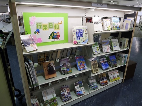 ■テーマ展示コーナー(貸出カウンター正面)「りんごの棚」■展示コーナー(貸出カウンター正面)「行楽日和」