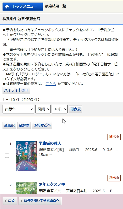 (3)検索結果一覧から予約したい資料にチェックを入れて「予約かごへ」をタップします。または、予約したい資料の詳細画面の「予約かごへ」をタップします。